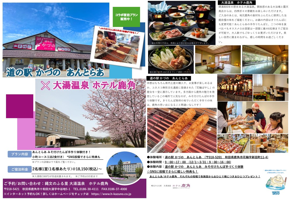 お得に鹿角を満喫できるご宿泊プランになっています。プランの詳細はご予約ページ・または下記のパンフレットをご覧ください。